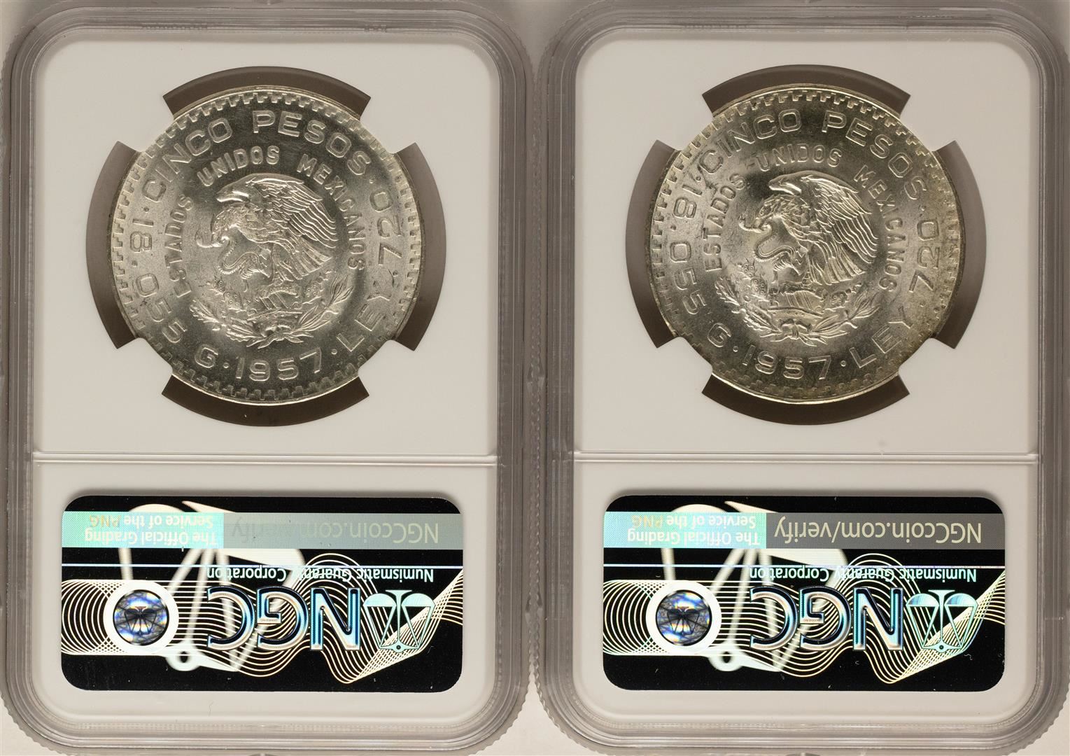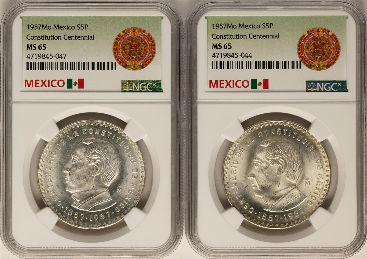 Lot of (2) 1957Mo Mexico 5 Pesos Constitution Centennial Silver Coins NGC MS65