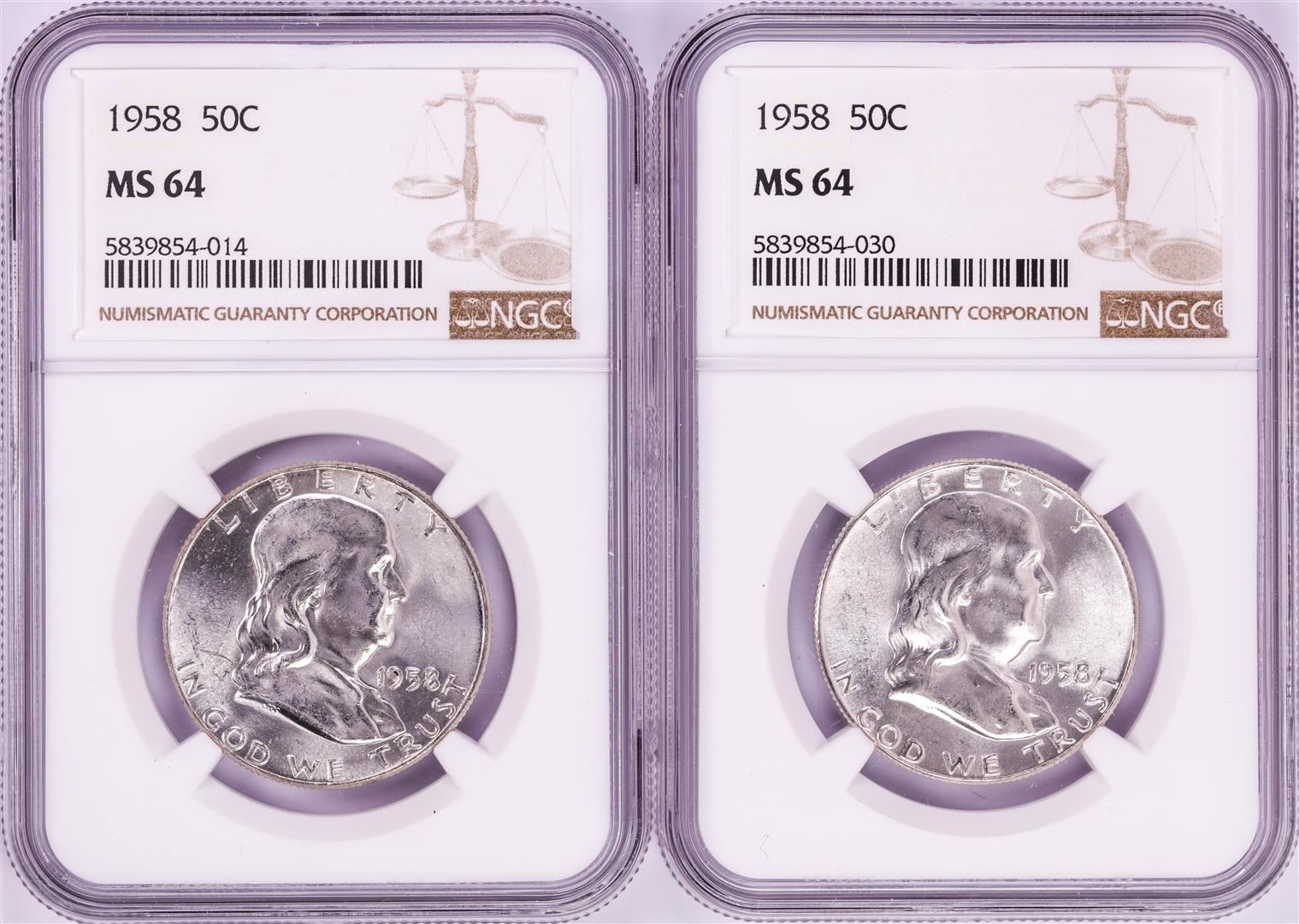 One Lot of (2) 1958 Franklin Half Dollar Coins NGC MS64. NGC Certified.