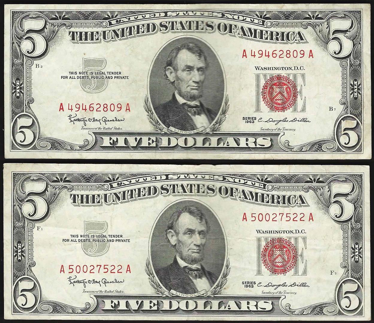 One Lot of (2) 1963 $5 Legal Tender Notes.