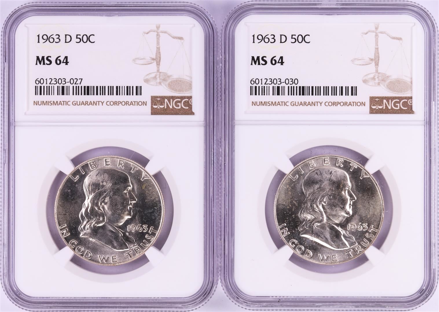 One Lot of (2) 1963-D Franklin Half Dollar Coins NGC MS64. NGC Certified.