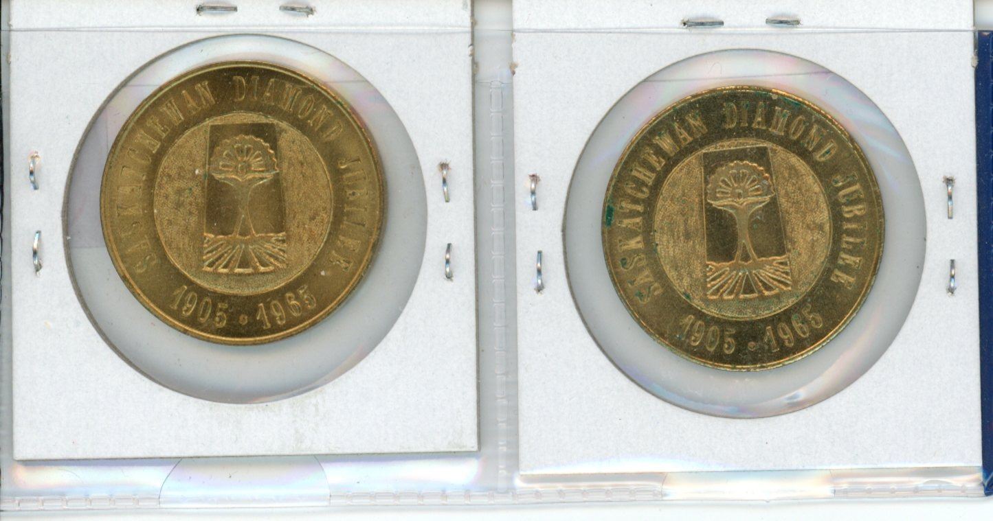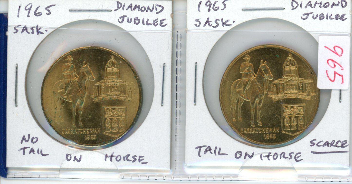 Lot of 2 1965 Saskatchewan Diamond Jubilee Medals. Includes No Tail on Horse and Scarce Tail on Horse with Doubling of 1965 & SASKATCHEWAN. Both Uncirculated.