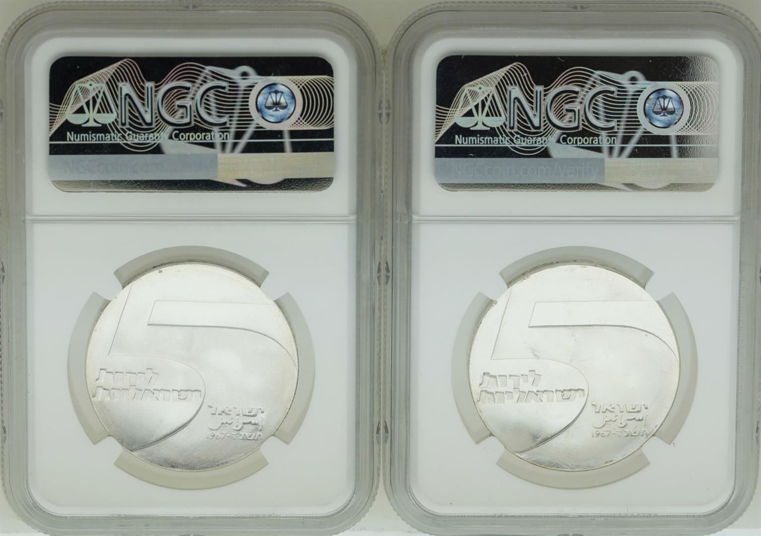 Lot of (2) 1967 Israel 5 Lirot Port of Eilat Silver Coins NGC MS66/PF66