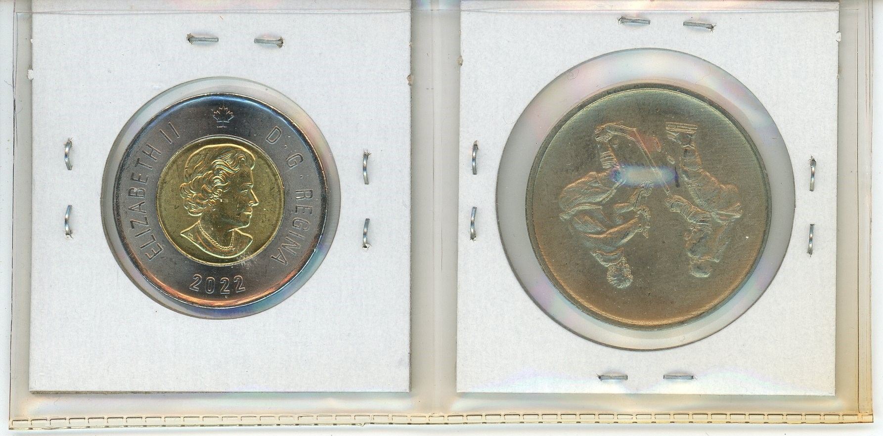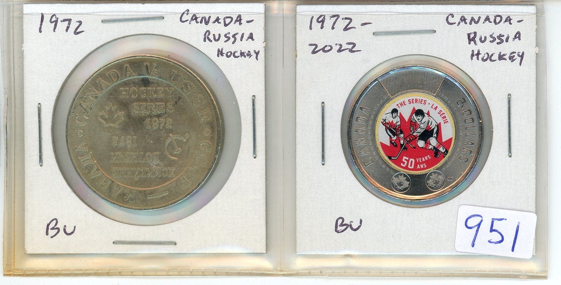 Lot of 2 1972 Canada-Russia Hockey Series Medals & Toonie. Both are BU. 2022 Toonie is Coloured.