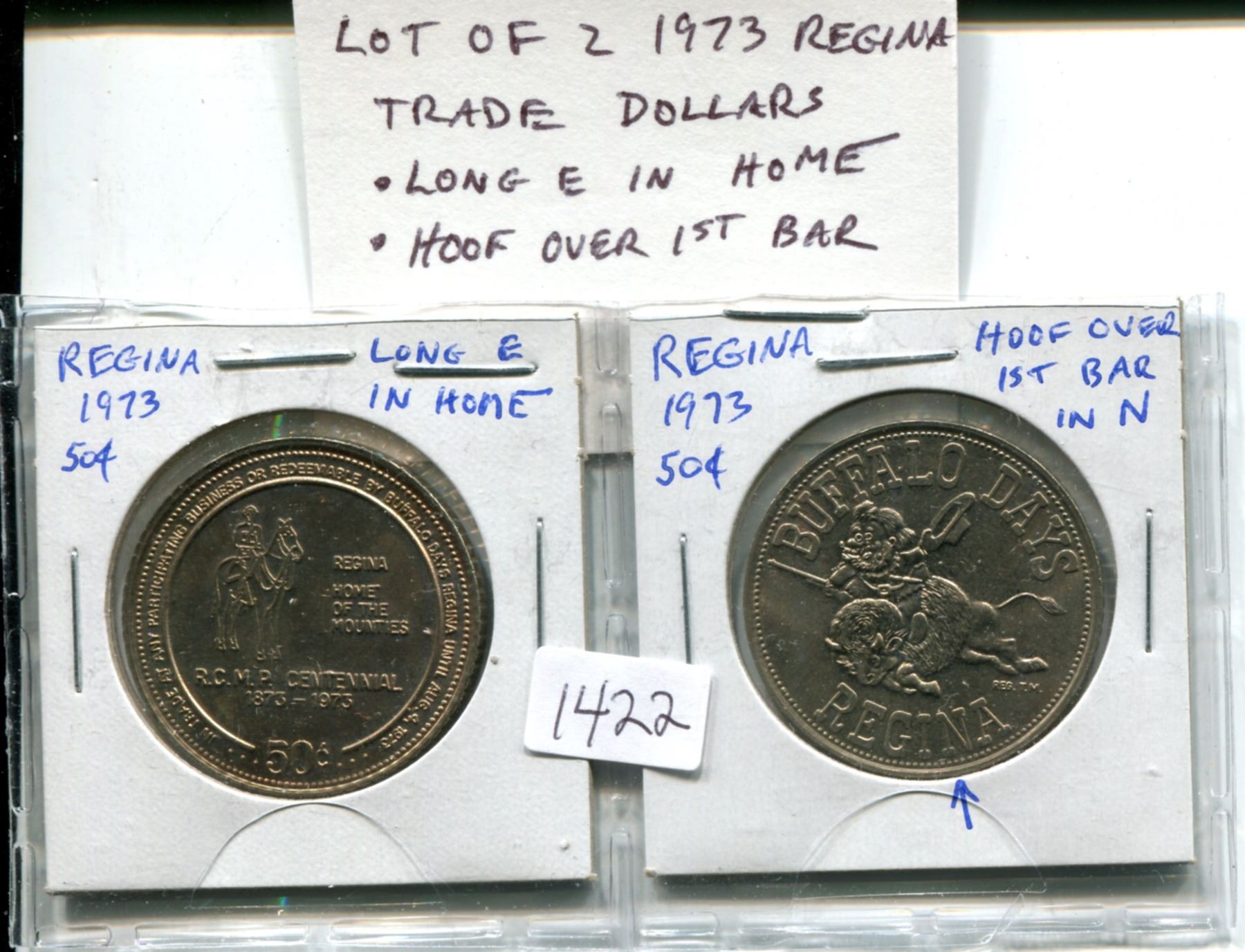 Lot of 2 1973 Regina Trade Dollar varieties. Includes Long E in HOME and Hoof Over 1st Bar in N. Bot