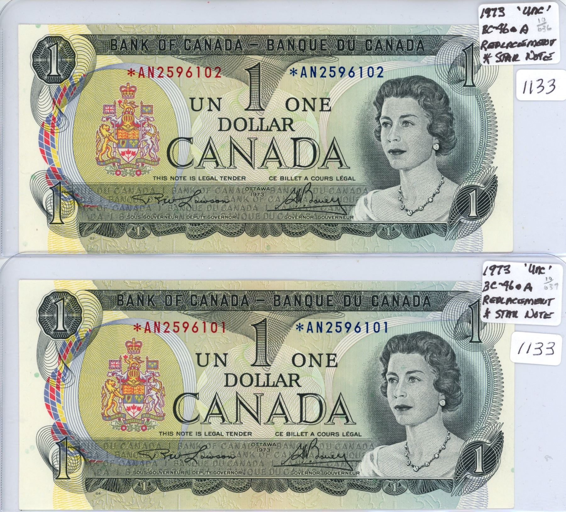Lot of 2 1973 * replacement $1 bills in sequence