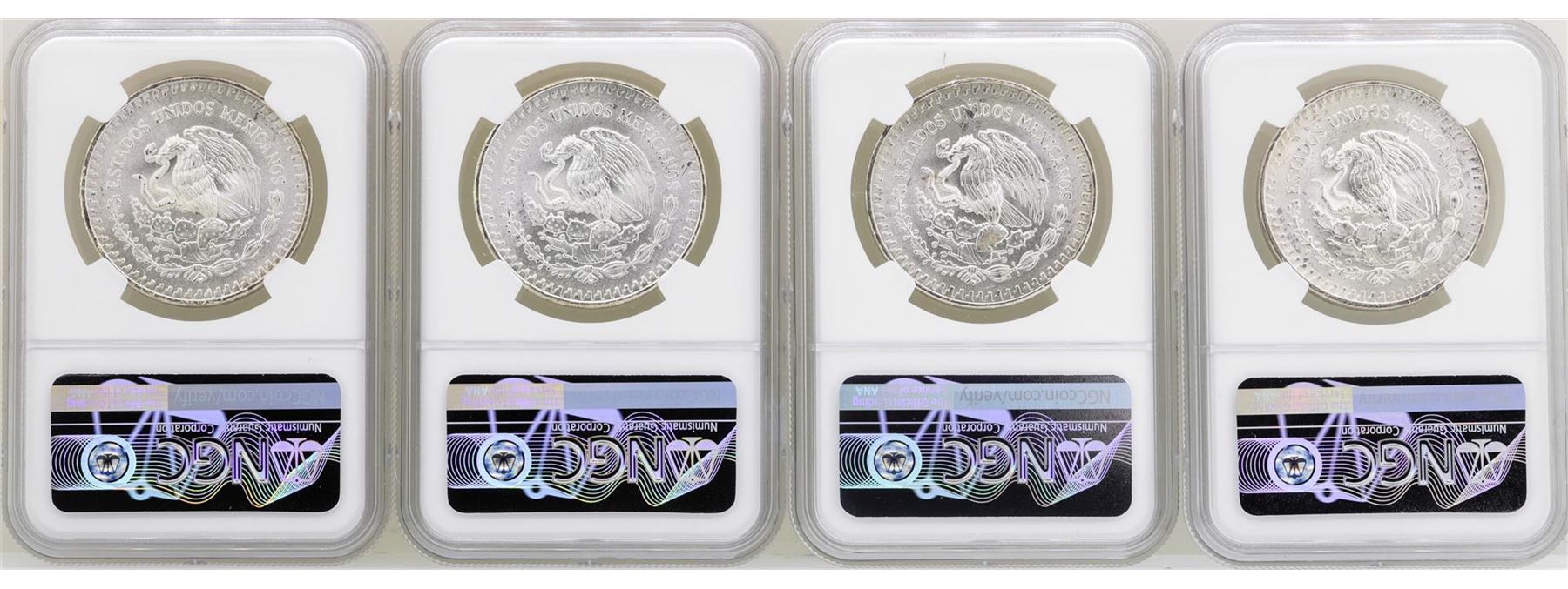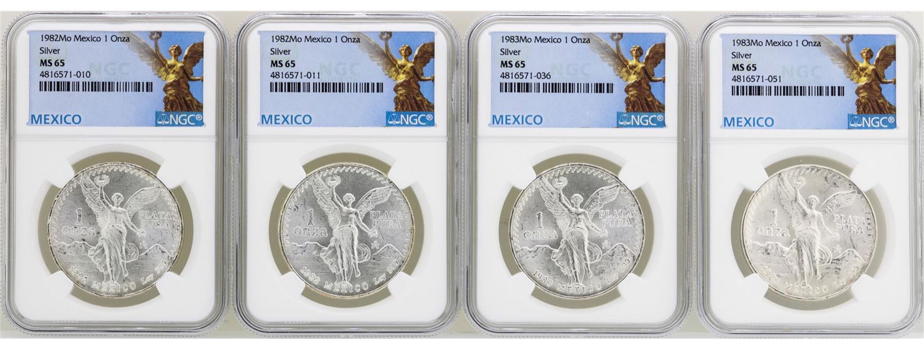 One Lot of (2) 1982Mo & (2) 1983Mo Mexico Libertad Onza Silver Coins NGC MS65. NGC Certified.