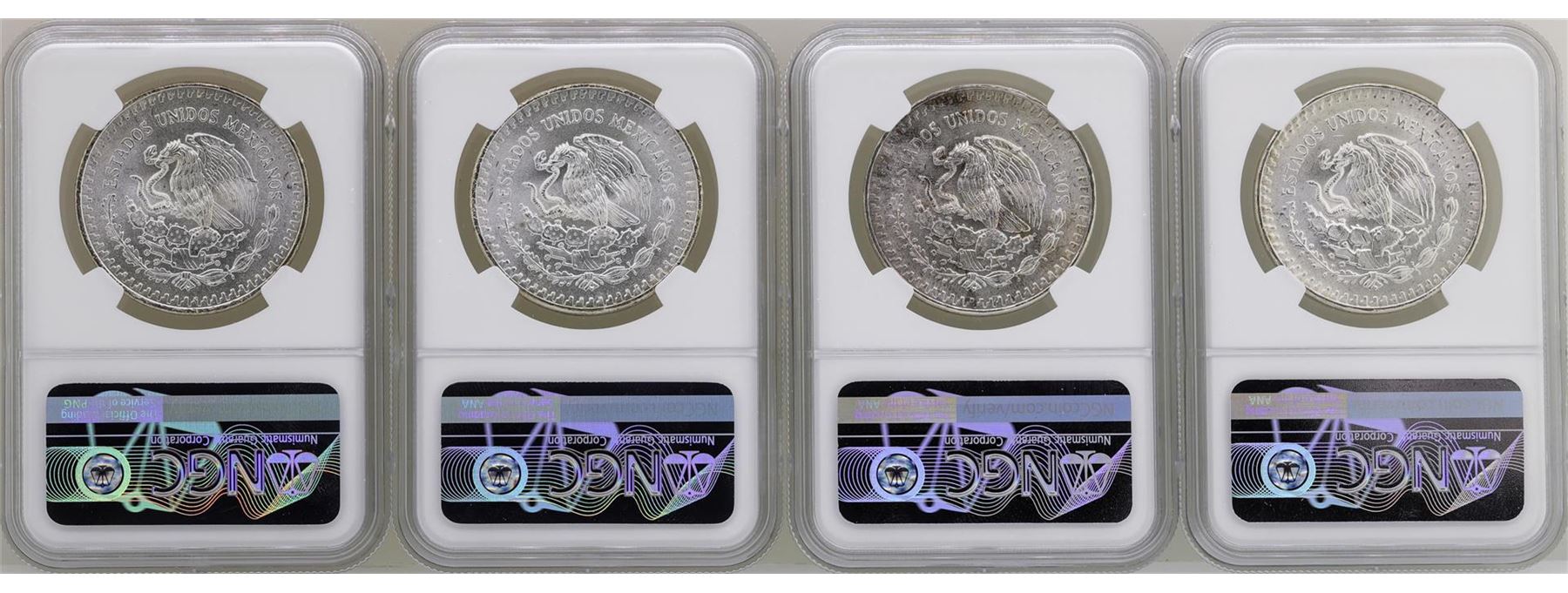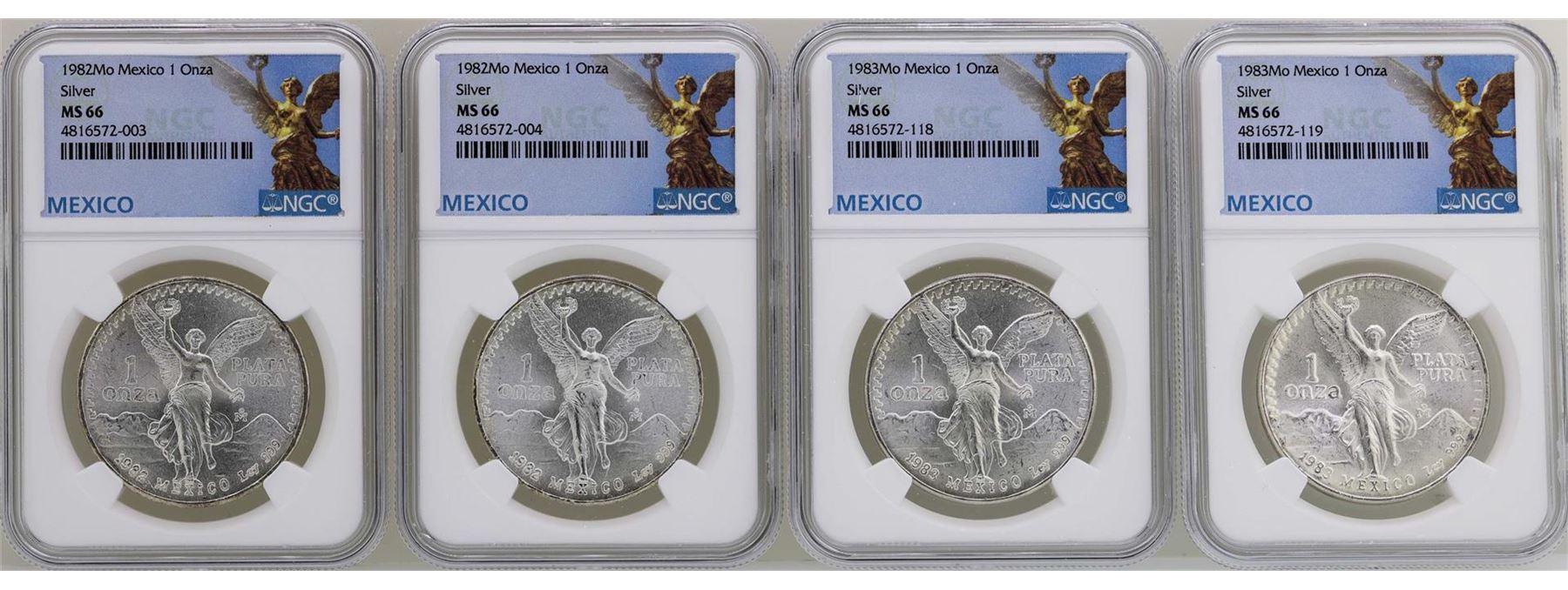 One Lot of (2) 1982Mo & (2) 1983Mo Mexico Libertad Onza Silver Coins NGC MS66. NGC Certified.