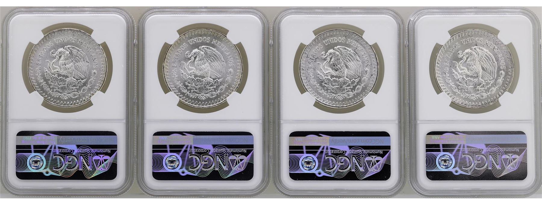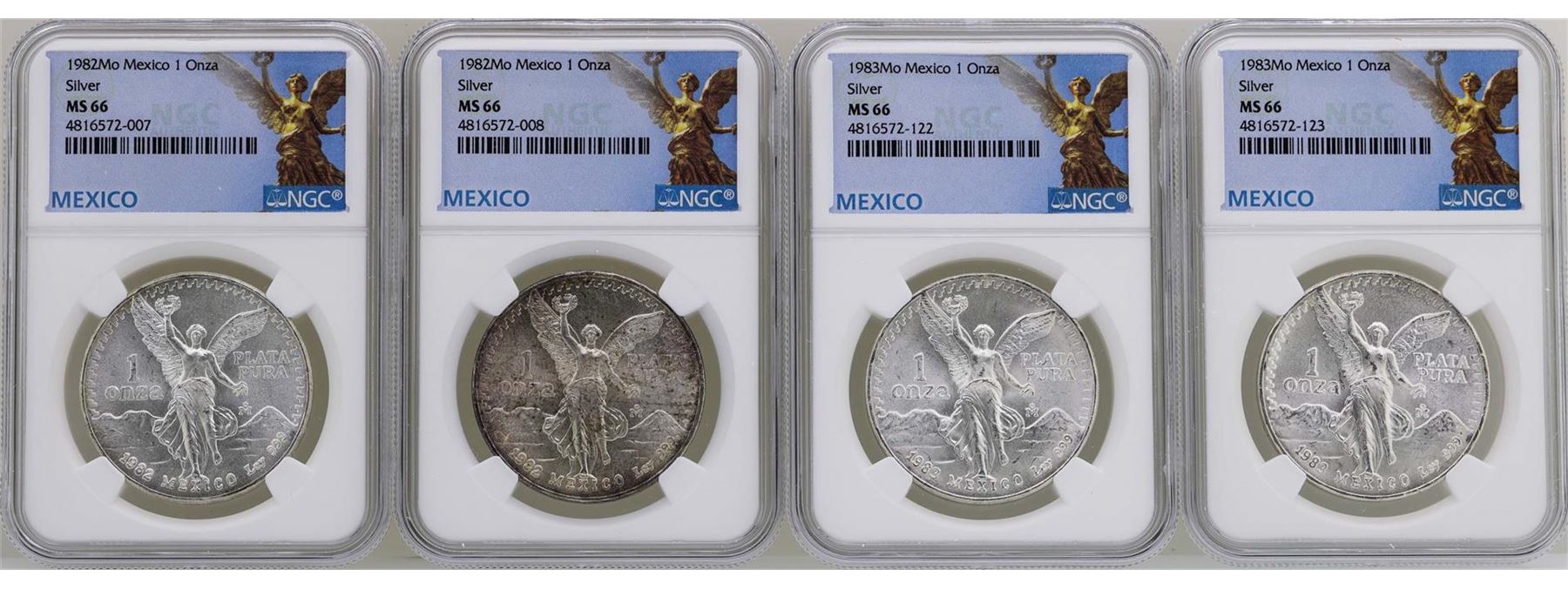 One Lot of (2) 1982Mo & (2) 1983Mo Mexico Libertad Onza Silver Coins NGC MS66. NGC Certified.