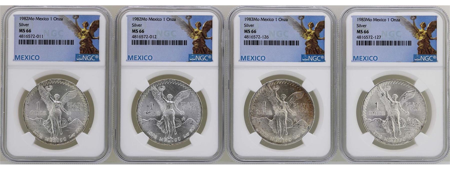 One Lot of (2) 1982Mo & (2) 1983Mo Mexico Libertad Onza Silver Coins NGC MS66. NGC Certified.