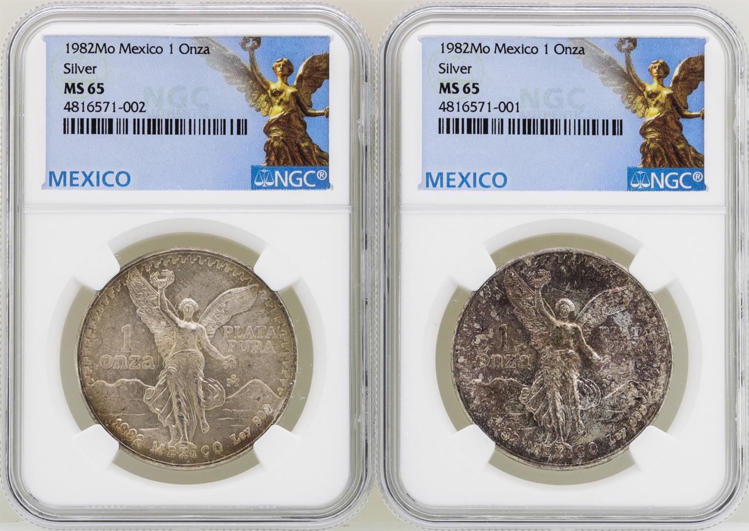 One Lot of (2) 1982Mo Mexico Libertad Onza Silver Coins NGC MS65. NGC Certified.