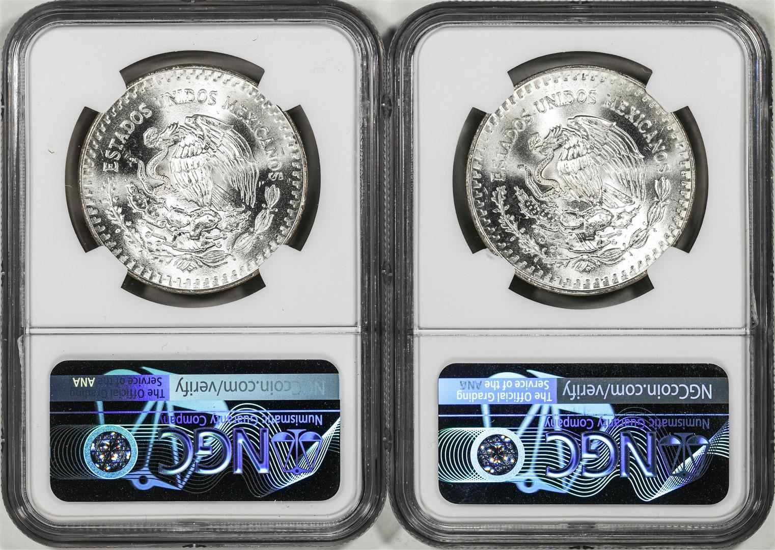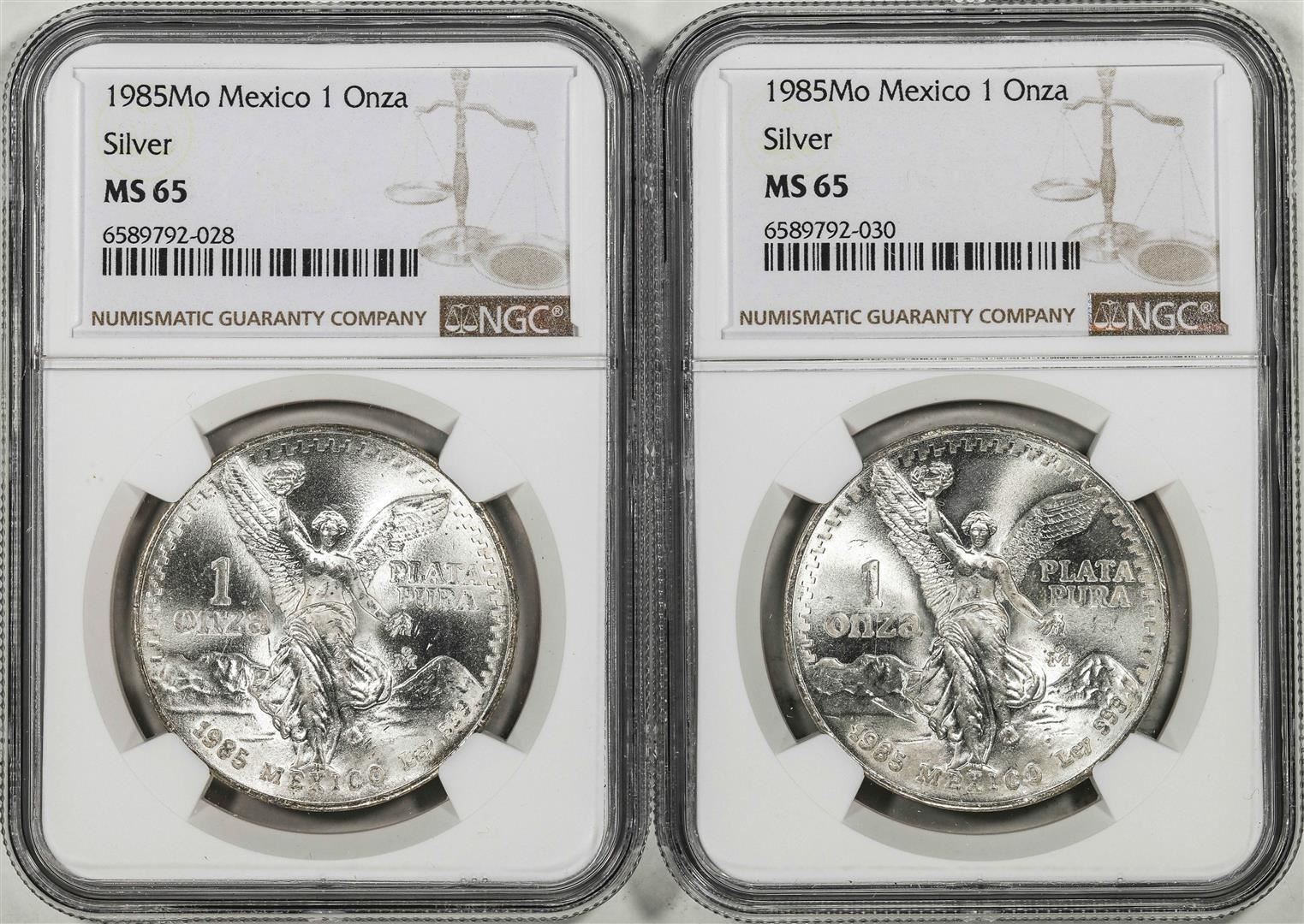 One Lot of (2) 1985Mo Mexico 1 Onza Libertad Silver Coins NGC MS65. NGC Certified.