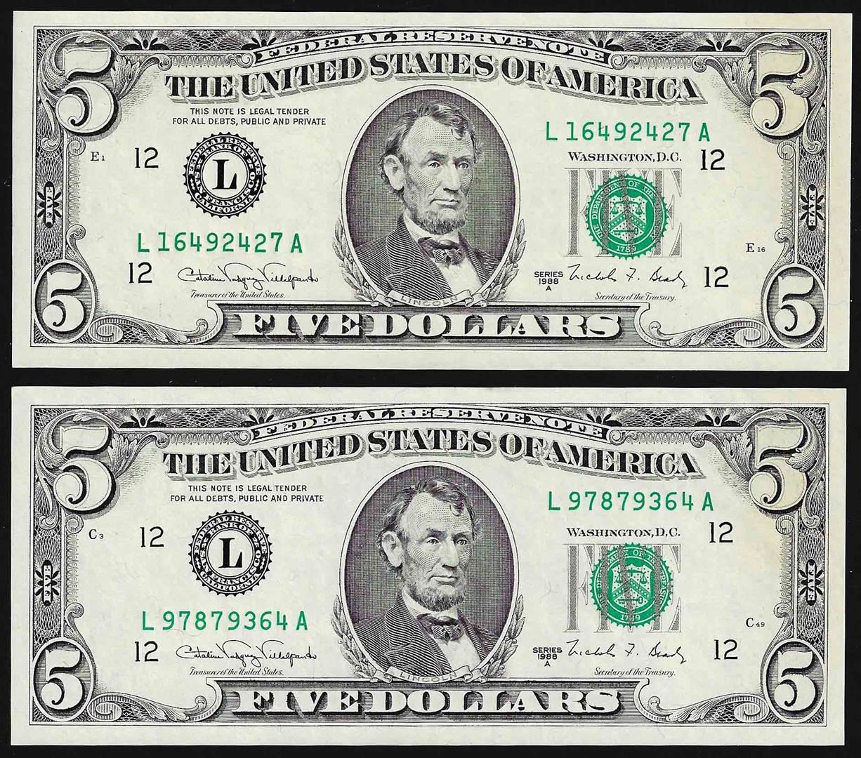 One Lot of (2) 1988A $5 Federal Reserve Notes Choice Uncirculated.