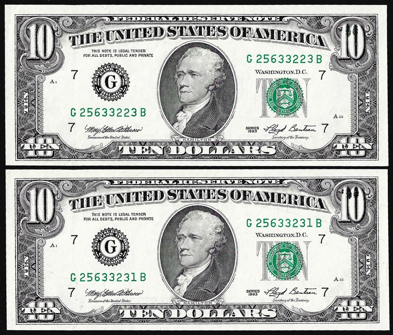 One Lot of (2) 1993 $10 Federal Reserve Notes Ink Smear ERROR.