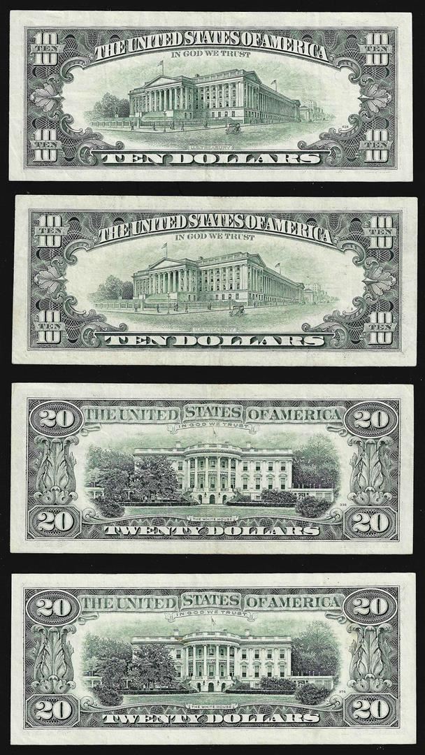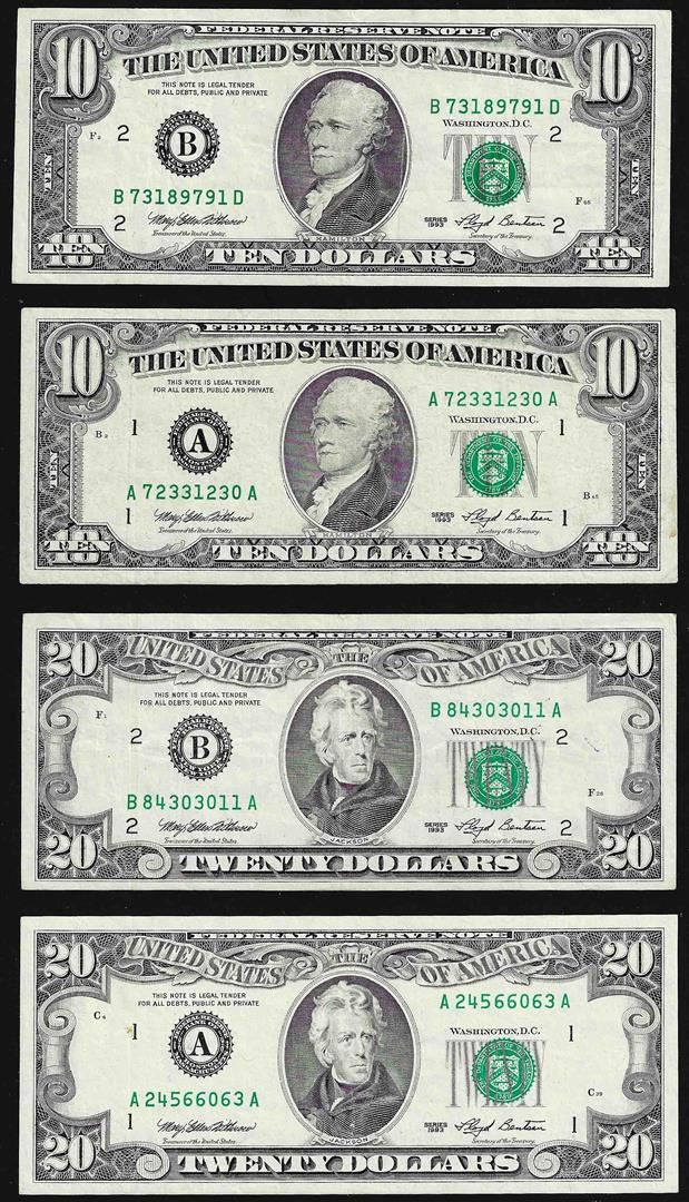 One Lot of (2) 1993 $20 & (2) $10 Federal Reserve Notes.