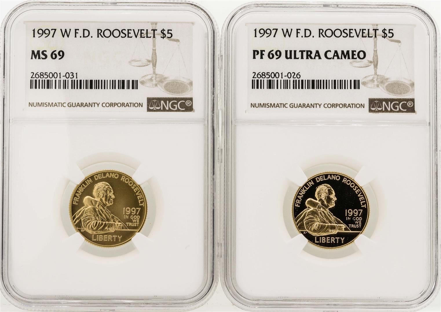 One Lot of (2) 1997-W $5 F.D. Roosevelt Gold Coins NGC MS69 & PF69 Ultra Cameo. NGC Certified.