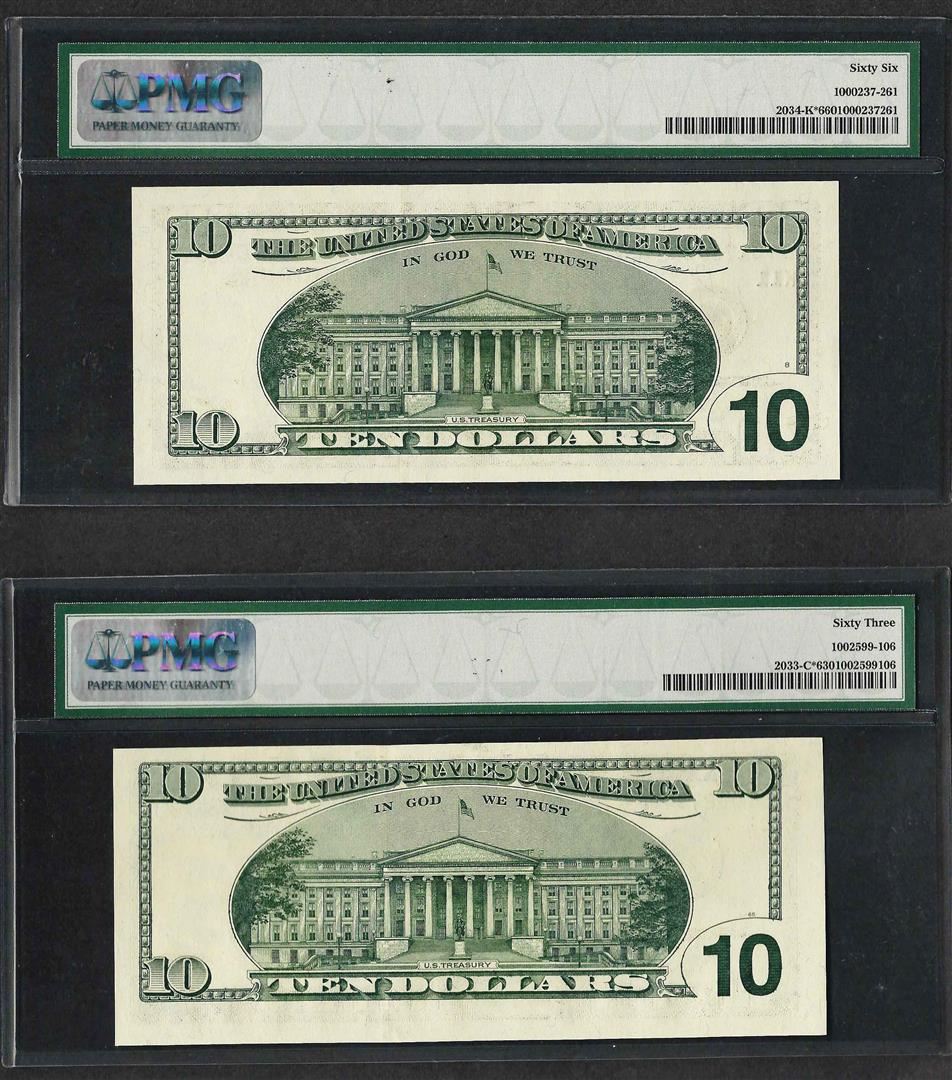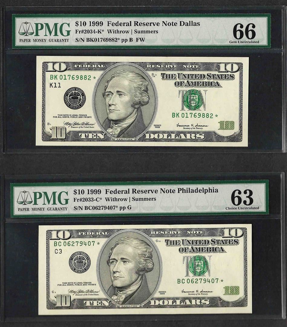 One Lot of (2) 1999 $10 Federal Reserve Notes PMG Gem Unc. 66 & Choice Unc. 63. PMG Certified.
