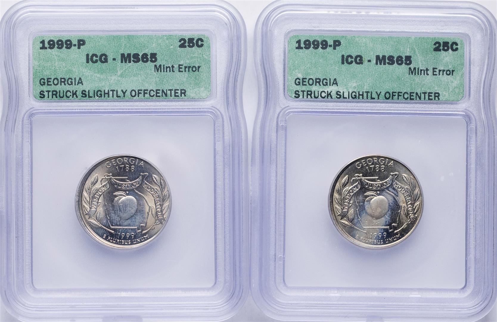 One Lot of (2) 1999-P Georgia State Quarter Coins ICG MS65 Struck Slightly Offcenter. ICG Certified.