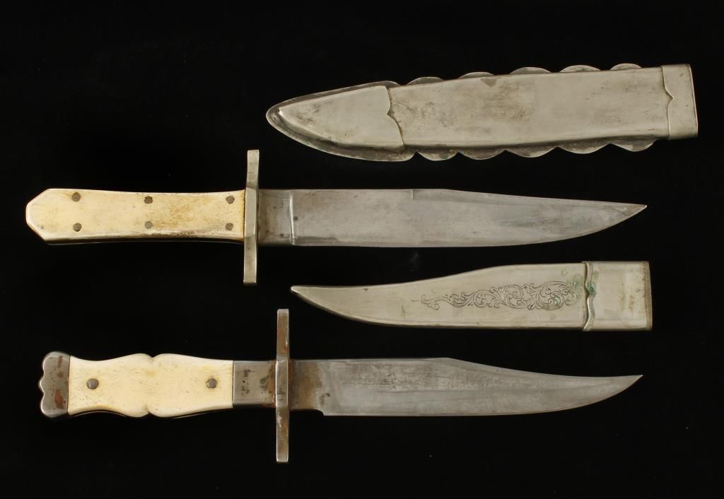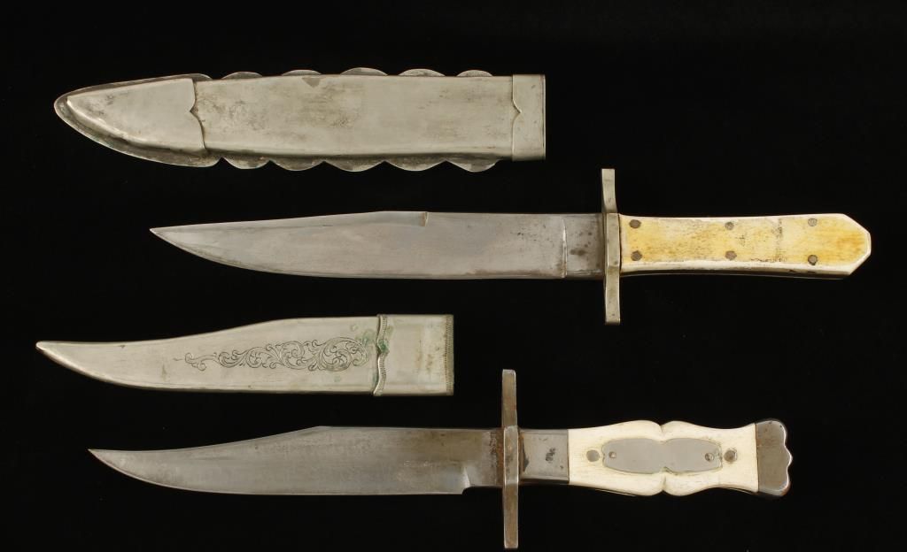 With bone grips, possibly by Hansen. Both knives in good condition with some modern aging.