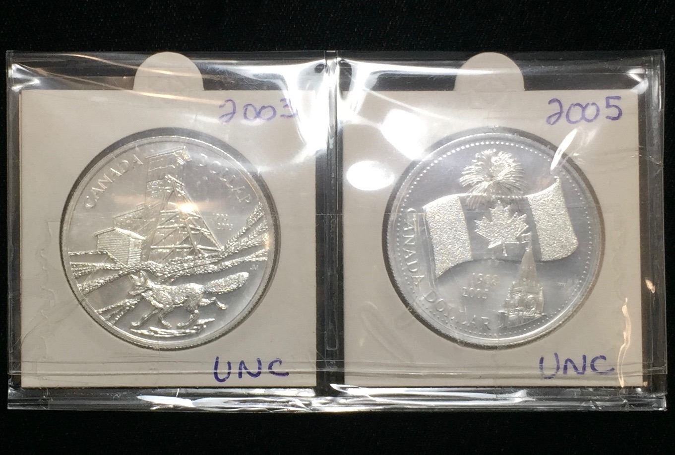 Lot 14; Fine silver .9999 Lot of 2 2003 $1 Cobalt Discovery and 2005 $1 Canada's National Flag 40th Anniversary BU Silver Coins