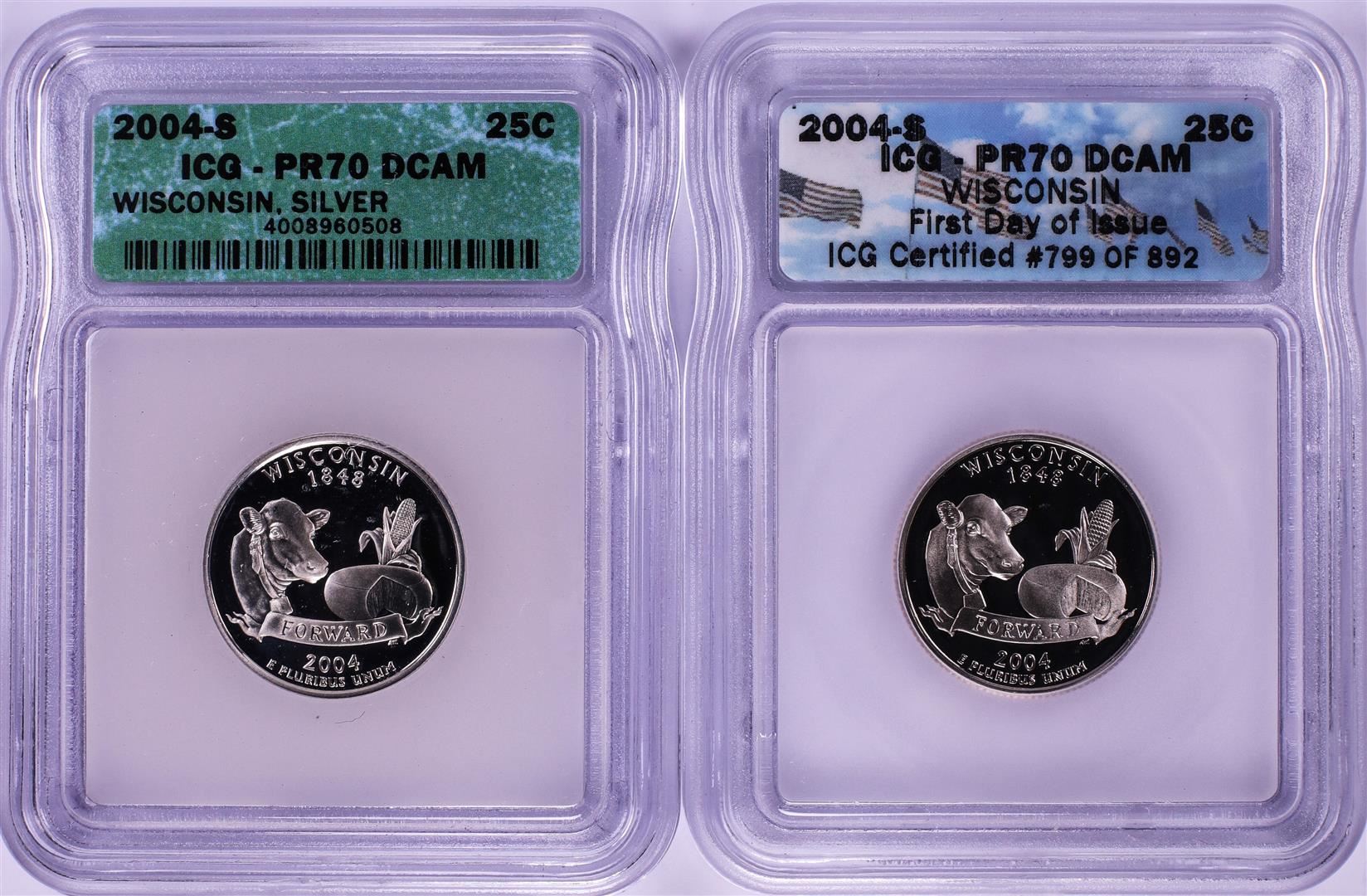 One Lot of (2) 2004-S Proof Silver State Quarter Coins ICG PR70DCAM. ICG Certified.