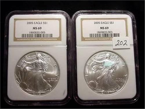 Lot of (2) 2005 Silver American Eagles NGC MS 69