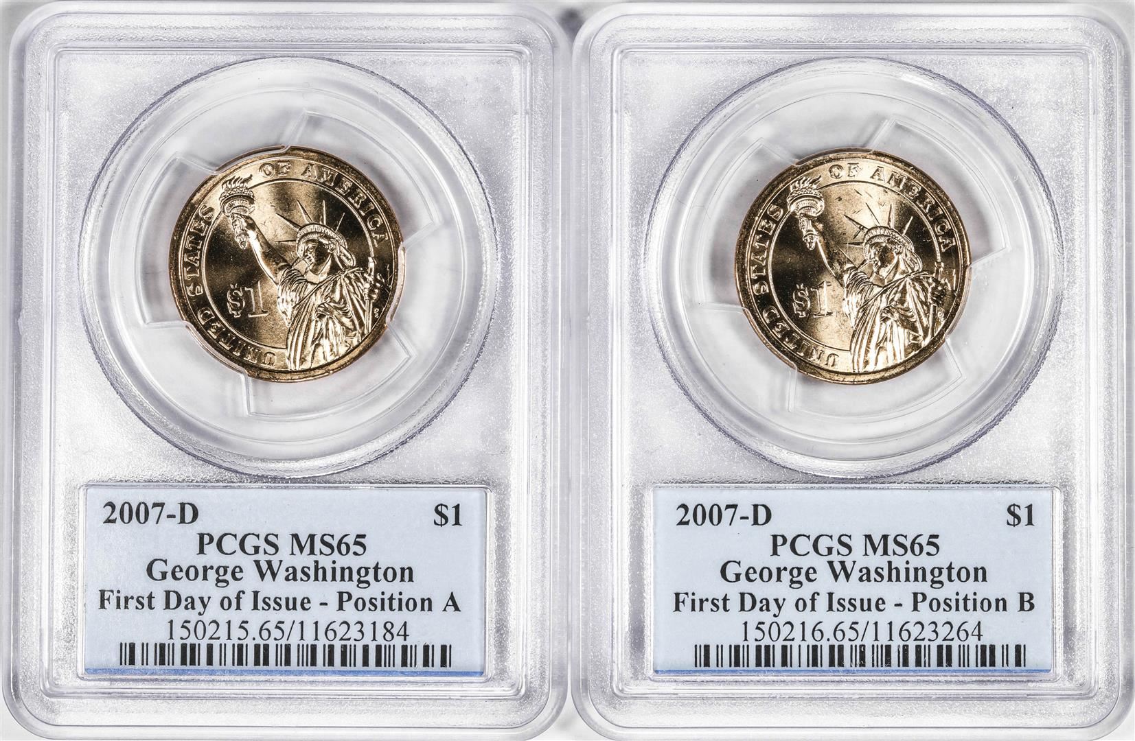 One Lot of (2) 2007-P George Washington Presidential Dollar Coins PCGS MS65. PCGS Graded.