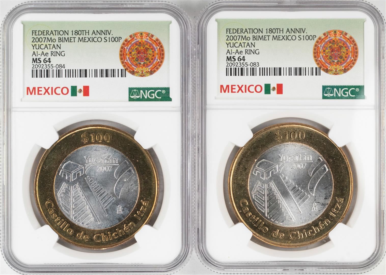 Lot of (2) 2007Mo Mexico Bi-metal 100 Pesos Silver Coins NGC MS64