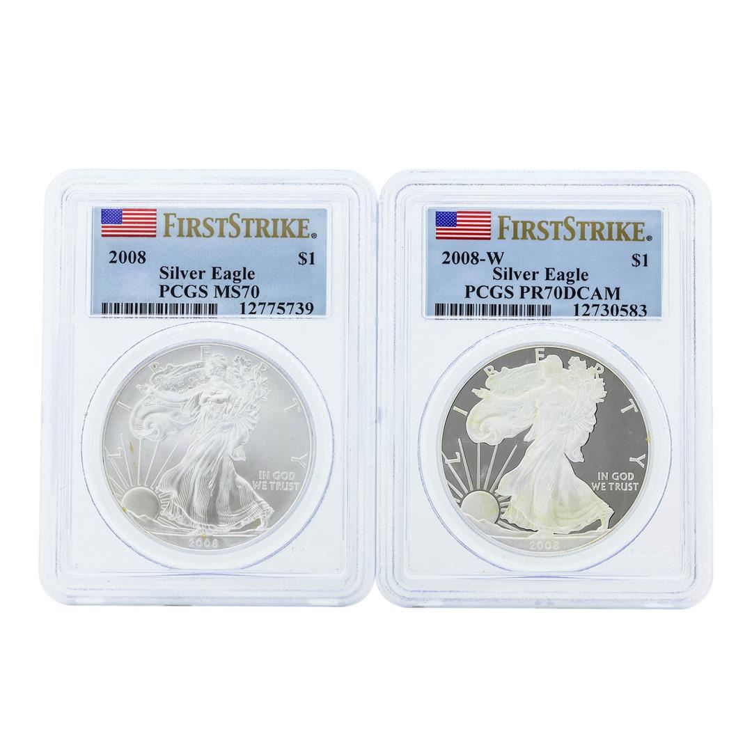 Lot of (2) 2008 $1 American Silver Eagle Coins PCGS MS70 & PR70DCAM