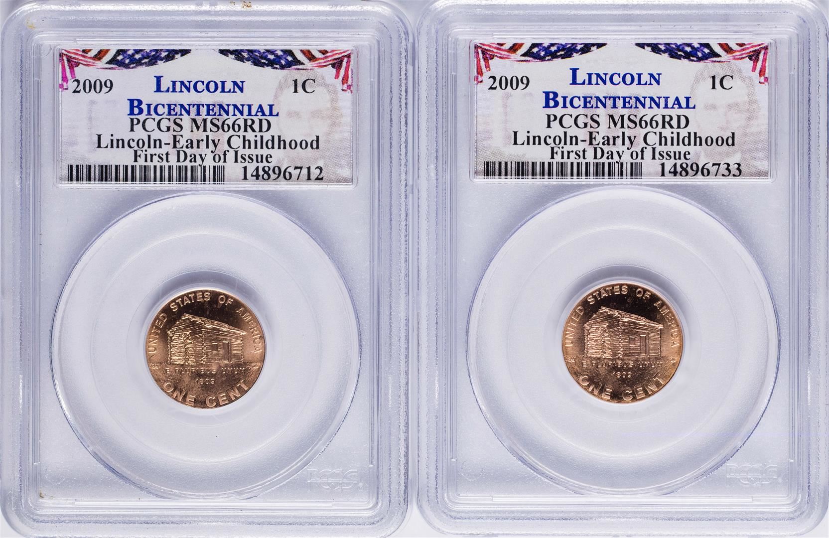 One Lot of (2) 2009 Bicentennial Lincoln Cent Coins PCGS MS66RD First Day of Issue. PCGS Graded.