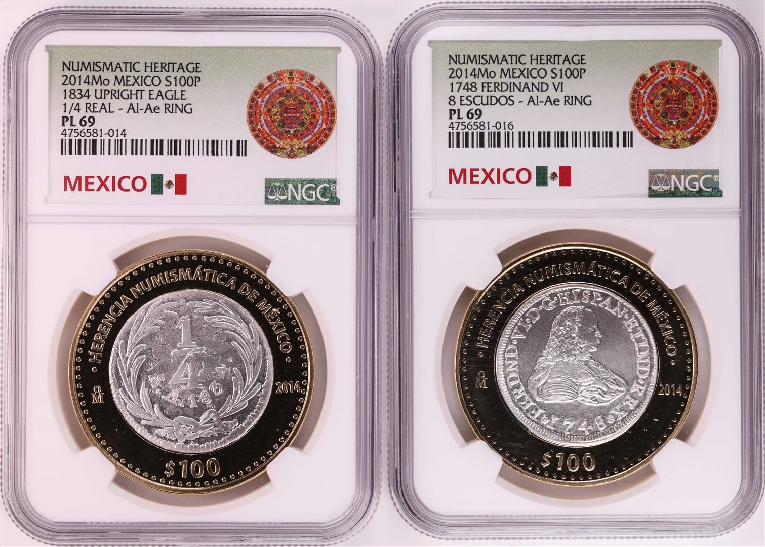 Lot of (2) 2014Mo Mexico 100 Pesos Bi-Metal Silver Coins NGC PL69