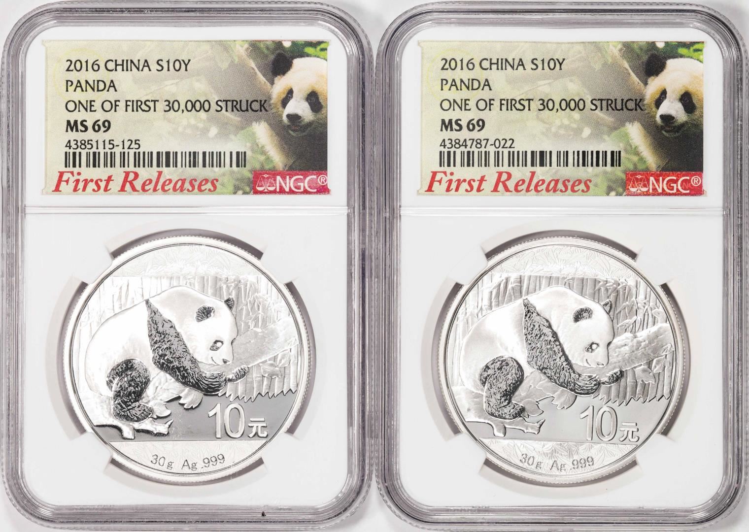 One Lot of (2) 2016 China 10 Yuan Silver Panda Coins NGC MS69 One of First 30,000 Struck. NGC Certified.
