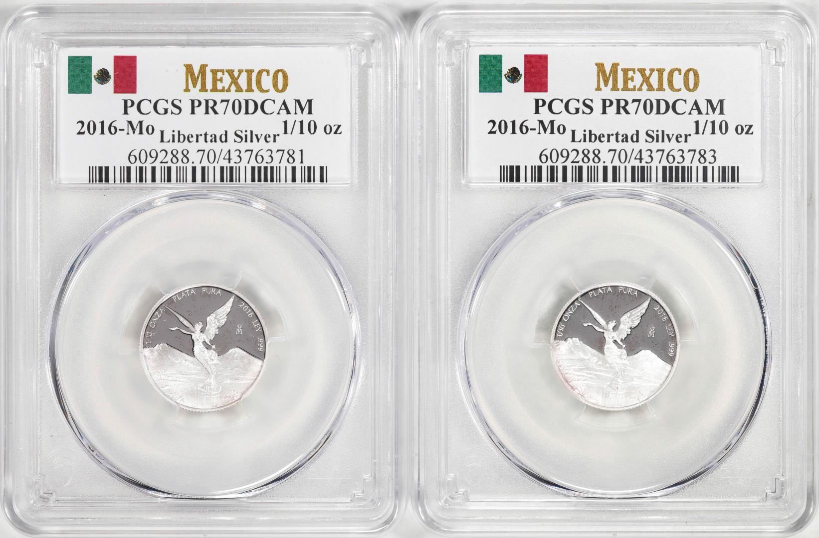 Lot of (2) 2016-Mo Mexico Proof 1/10 oz Silver Libertad Coins PCGS PR70DCAM