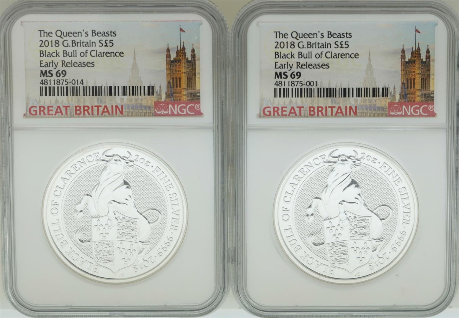 One Lot of (2) 2018 Great Britain 5 Pound Queen's Beasts Silver Coins NGC MS69 Early Releases. NGC Certified.
