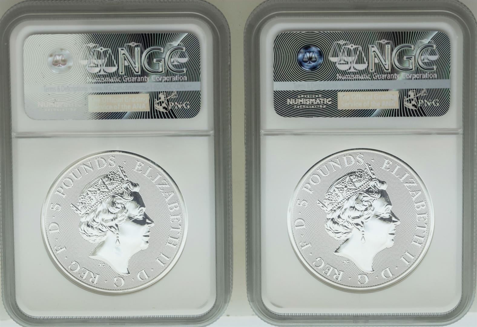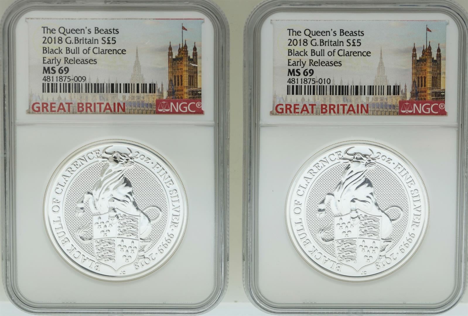 One Lot of (2) 2018 Great Britain 5 Pound Queen's Beasts Silver Coins NGC MS69 Early Releases. NGC Certified.