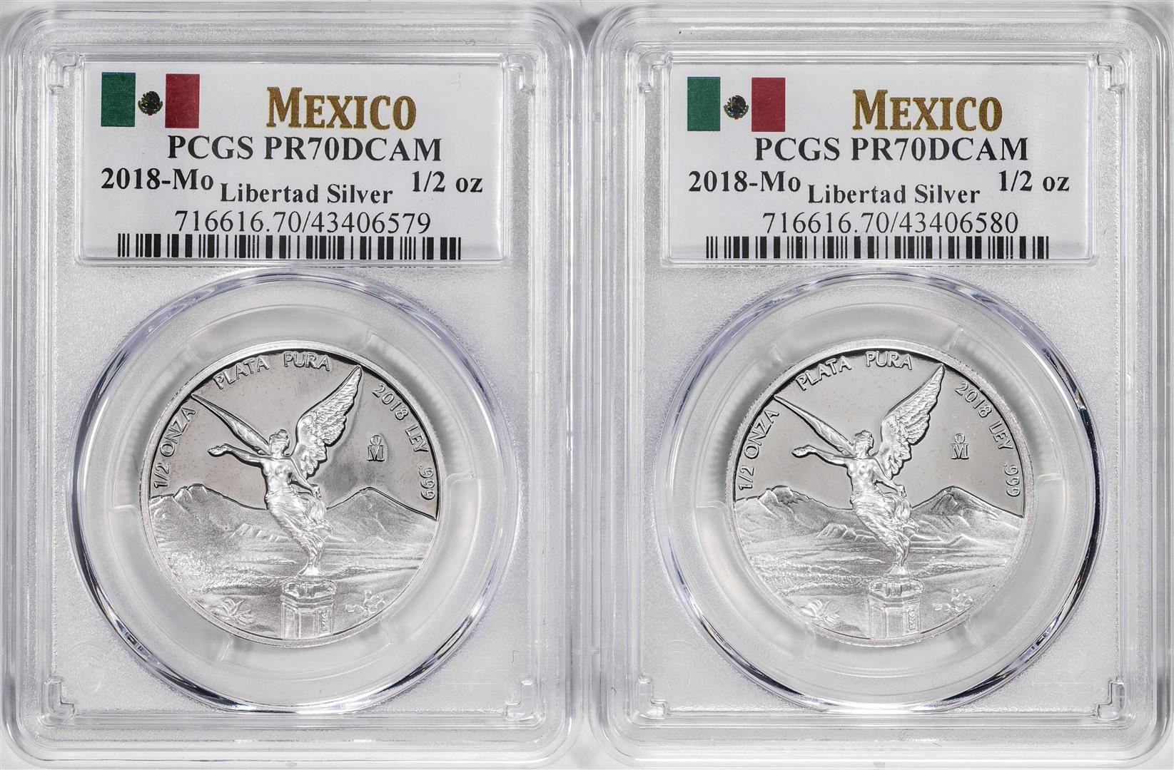 Lot of (2) 2018-Mo Mexico Proof 1/2 oz Silver Libertad Coins PCGS PR70DCAM