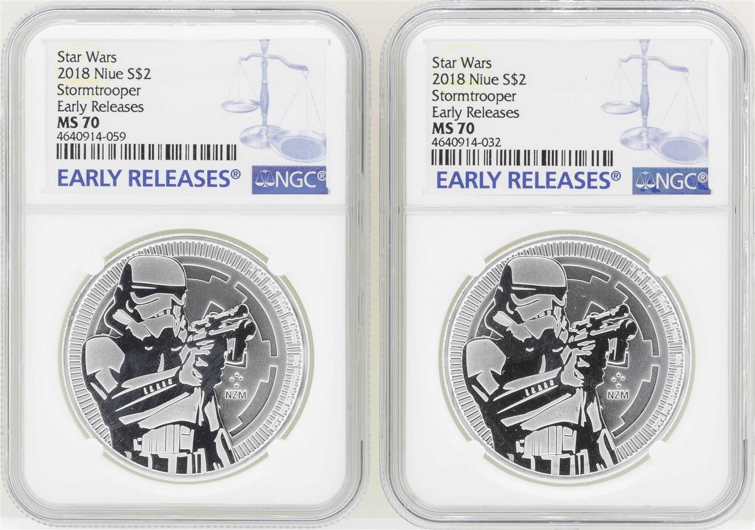 One Lot of (2) 2018 Niue $2 Star Wars Stormtrooper Silver Coins NGC MS70 Early Releases. NGC Certified.
