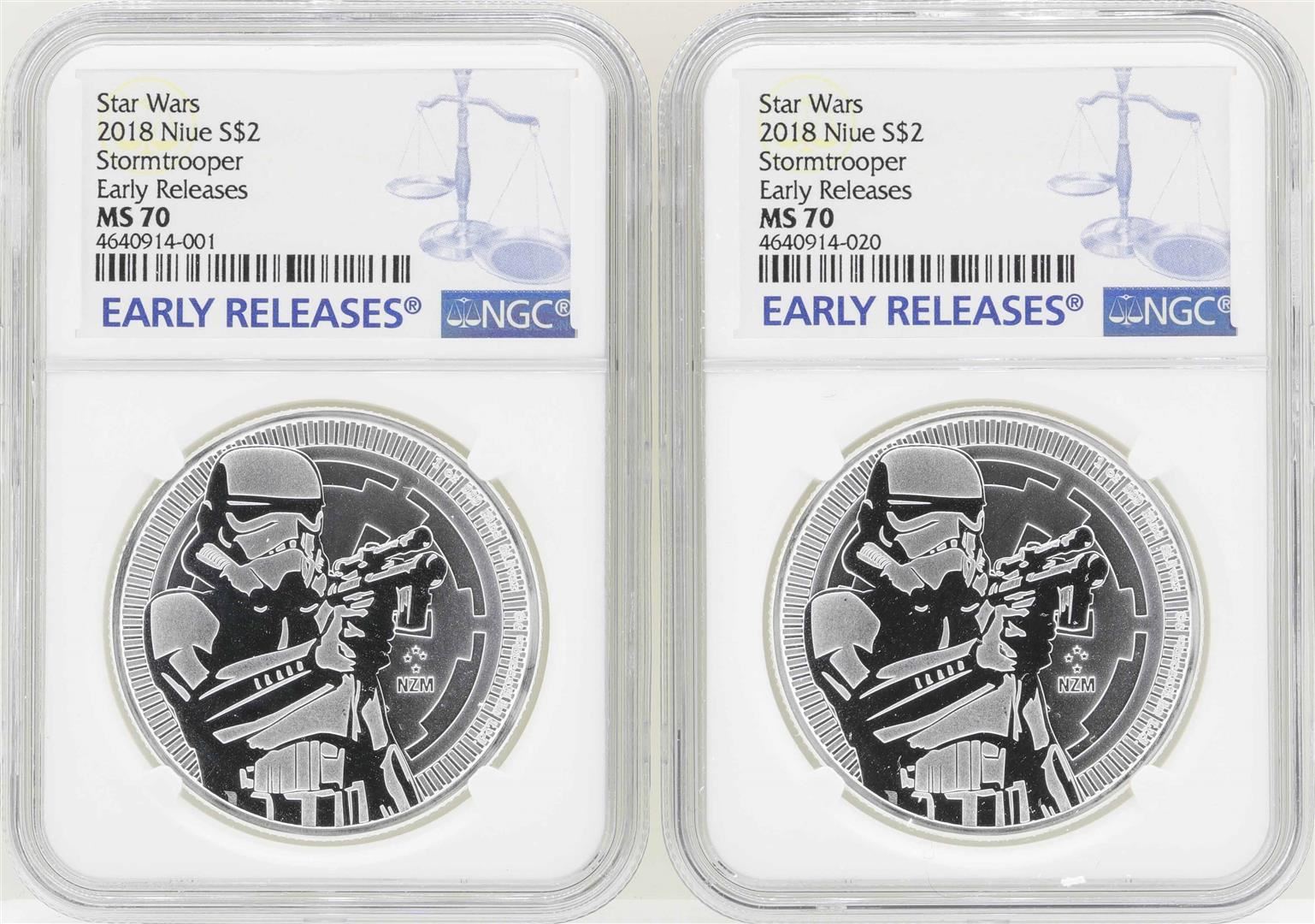 One Lot of (2) 2018 Niue $2 Star Wars Stormtrooper Silver Coins NGC MS70 Early Releases. NGC Certified.