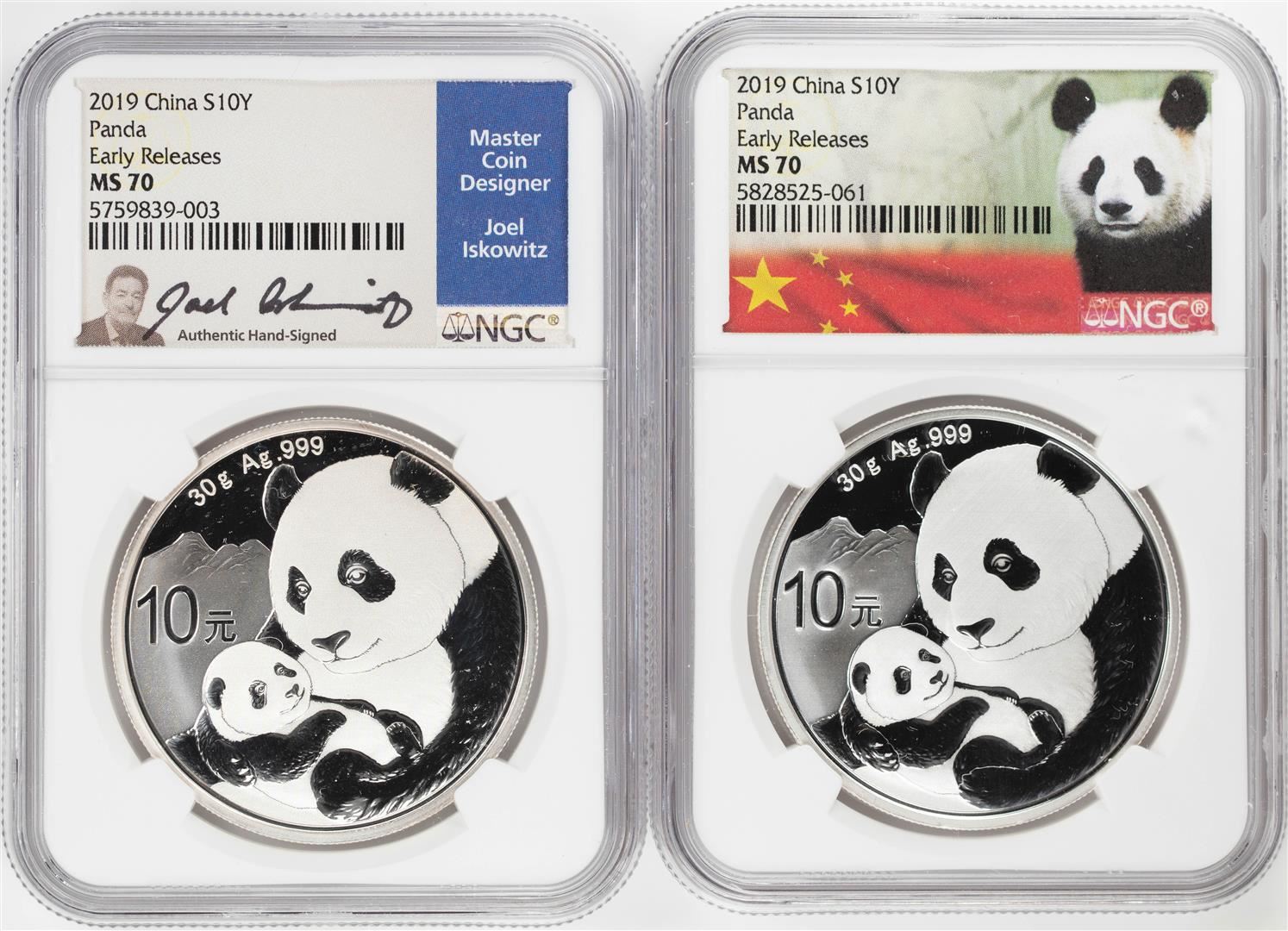 Lot of (2) 2019 China 10 Yuan Silver Panda Coins NGC MS70 Early Releases