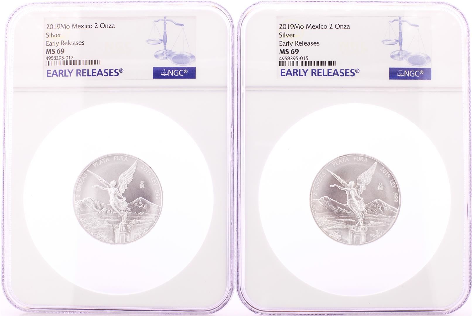 Lot of (2) 2019Mo Mexico 2 Onza Libertad Silver Coins NGC MS69 Early Releases