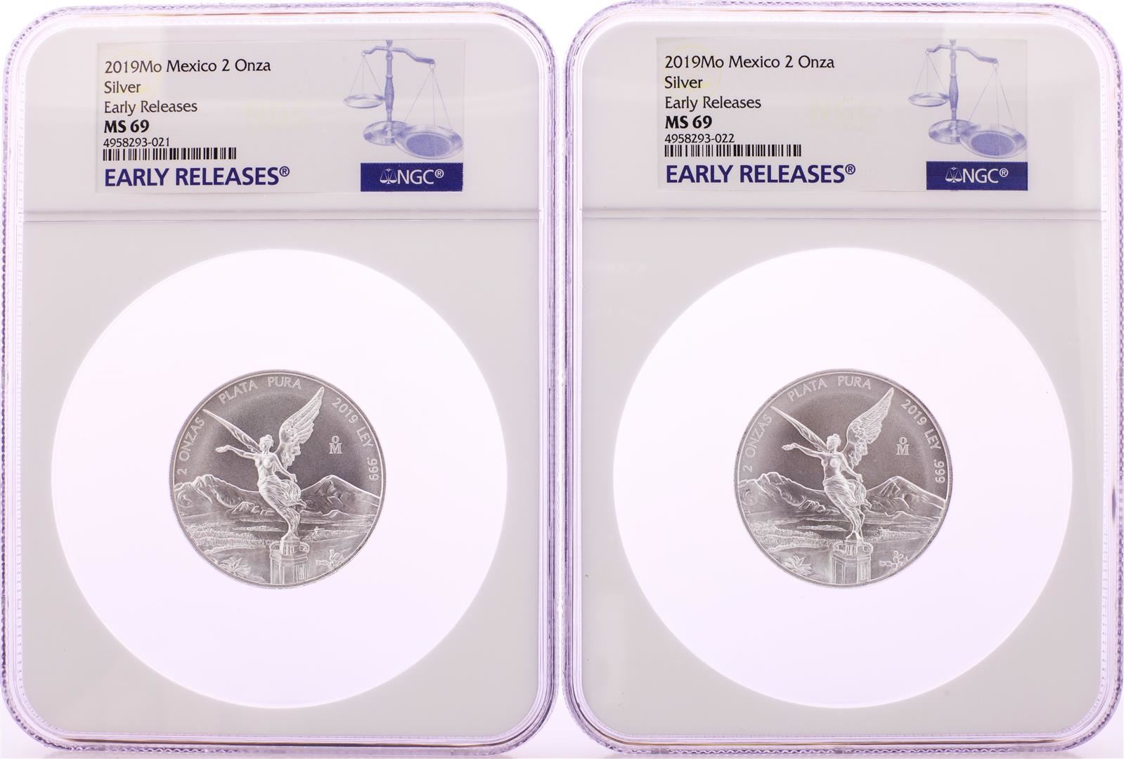Lot of (2) 2019Mo Mexico 2 Onza Libertad Silver Coins NGC MS69 Early Releases