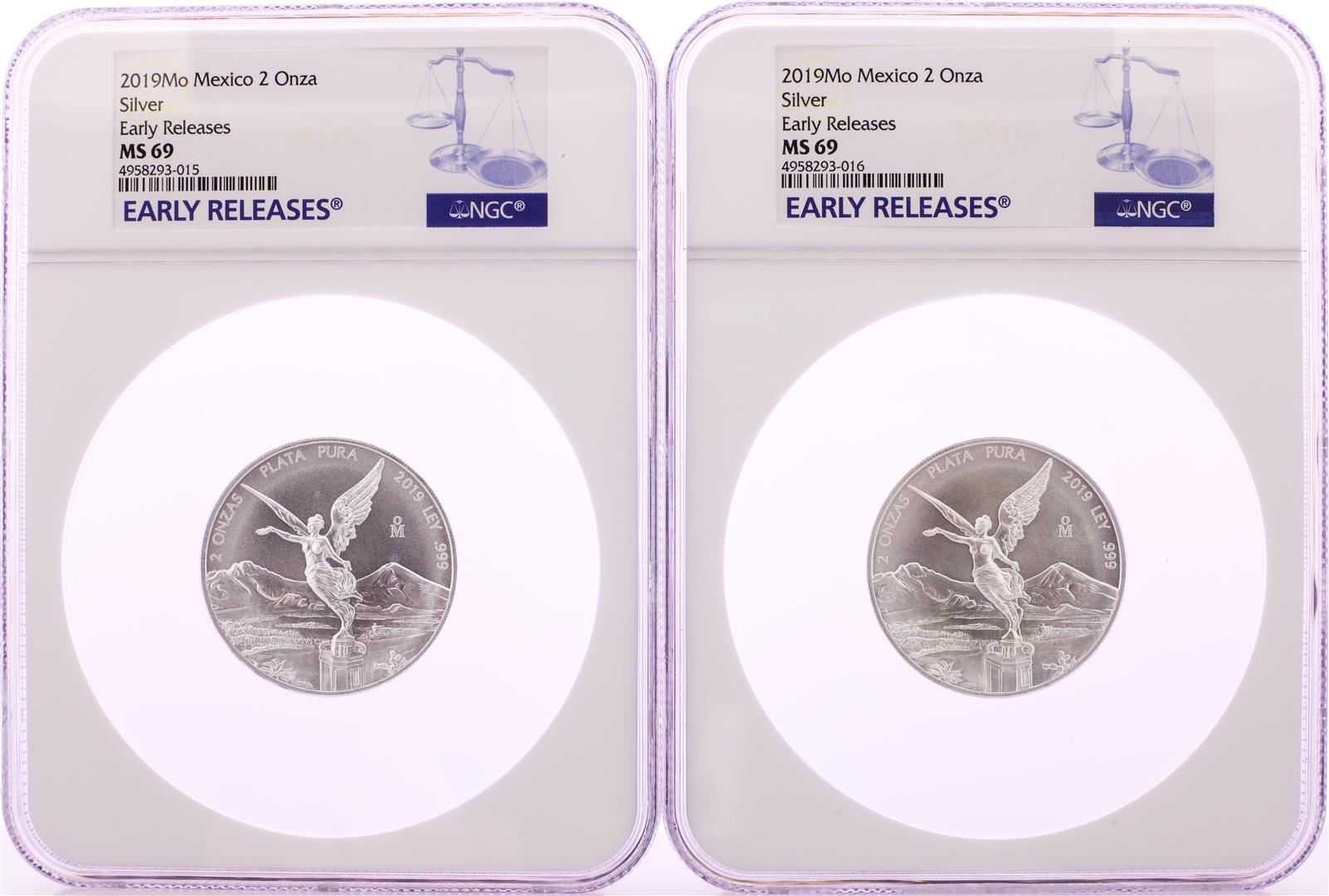 Lot of (2) 2019Mo Mexico 2 Onza Libertad Silver Coins NGC MS69 Early Releases