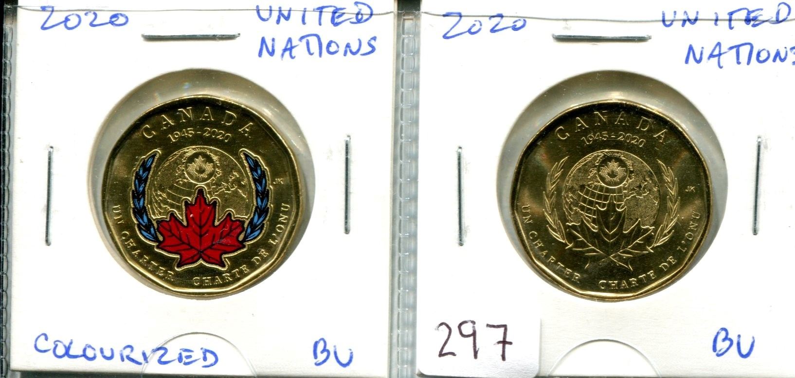Lot of 2 2020 Canadian United Nations Loon Dollars. Includes Colourized and Regular. Both BU, from a Mint Roll.