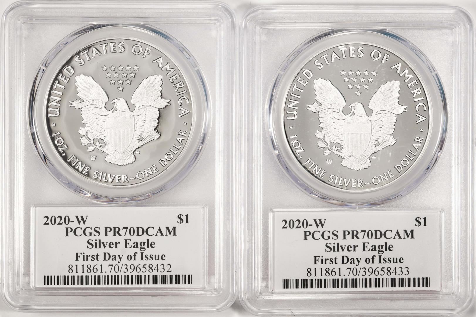 One Lot of (2) 2020-W $1 Proof American Silver Eagle Coin PCGS PR70DCAM FDOI. PCGS Graded.