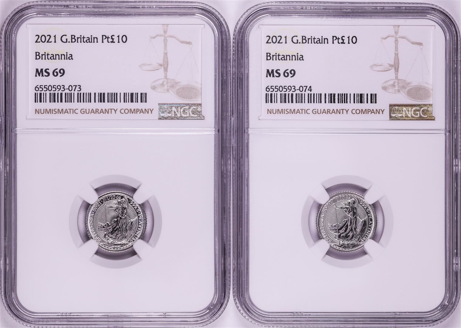 One Lot of (2) 2021 Great Britain 10 Pounds Britannia 1/10oz Platinum Coins NGC MS69. NGC Certified.