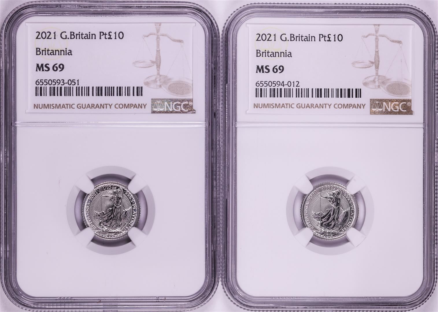 Lot of (2) 2021 Great Britain 10 Pounds Britannia 1/10oz Platinum Coins NGC MS69