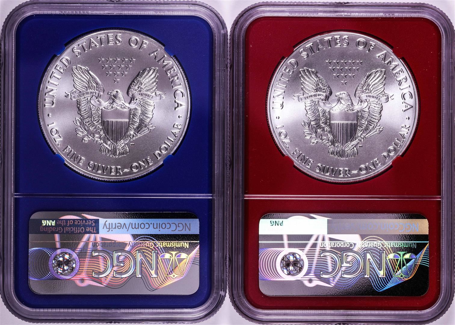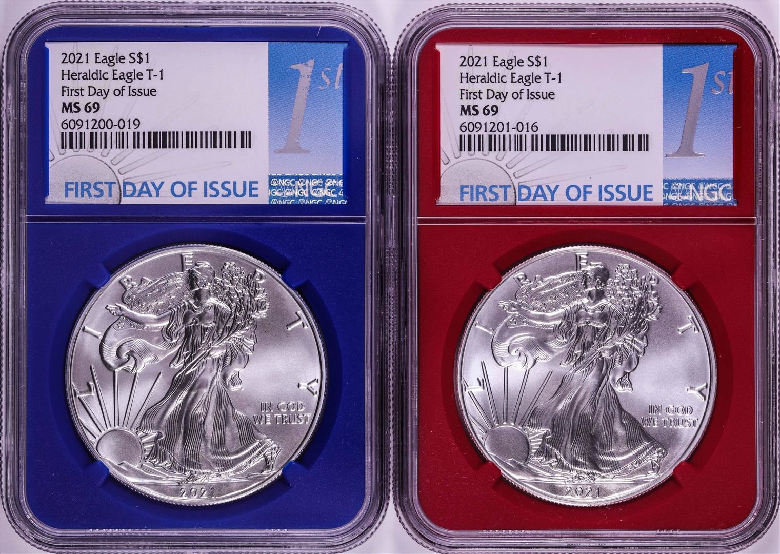 One Lot of (2) 2021 Type 1 $1 American Silver Eagle Coins NGC MS69 FDOI Red & Blue Cores. NGC Certified.