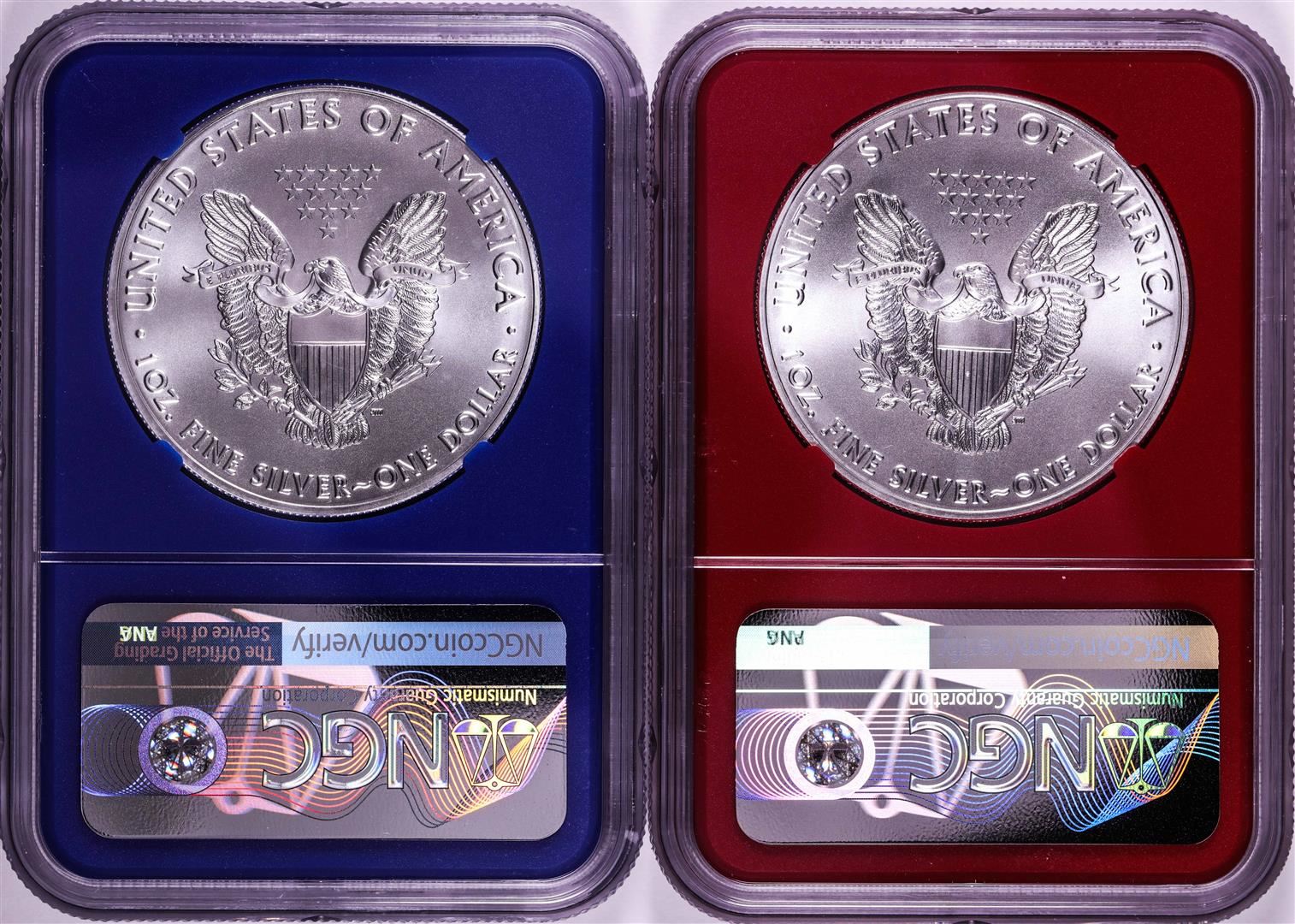 One Lot of (2) 2021 Type 1 $1 American Silver Eagle Coins NGC MS69 FDOI Red & Blue Cores. NGC Certified.