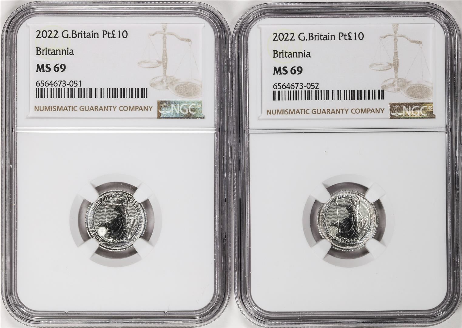 Lot of (2) 2022 Great Britain 10 Pounds Britannia 1/10oz Platinum Coins NGC MS69