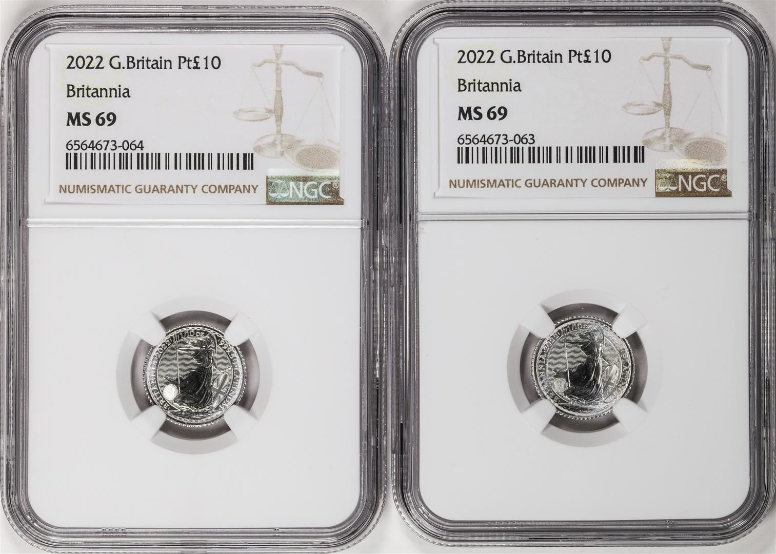 Lot of (2) 2022 Great Britain 10 Pounds Britannia 1/10oz Platinum Coins NGC MS69