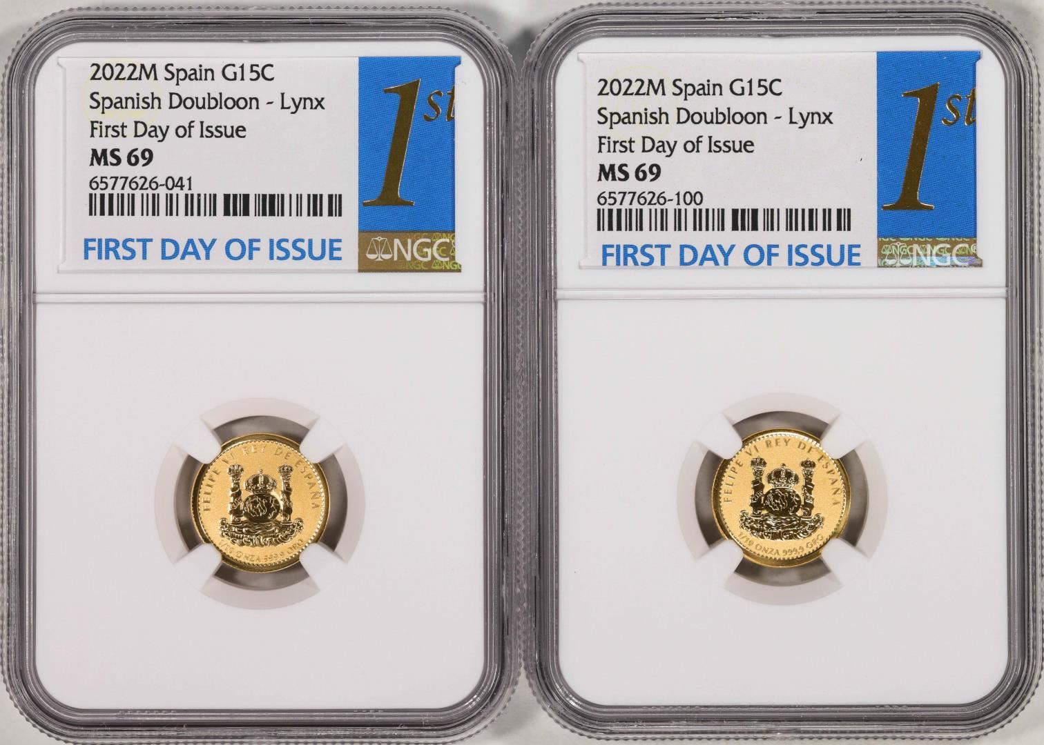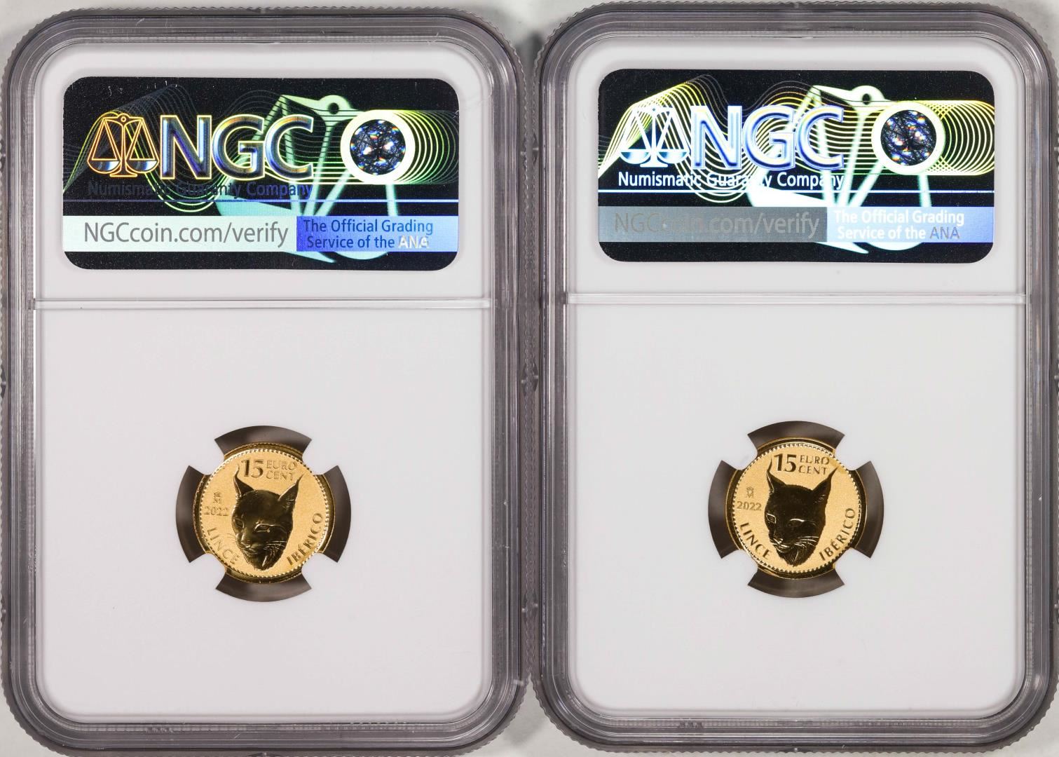 Lot of (2) 2022M Spain 15 Euro Cent Lynx Gold Doubloon Coins NGC MS69 FDOI